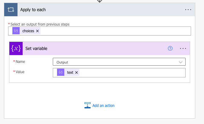 Add a “Set variable” action, and choose “text” as the value. It now will automaticaly put this inside an “Apply to each” loop.