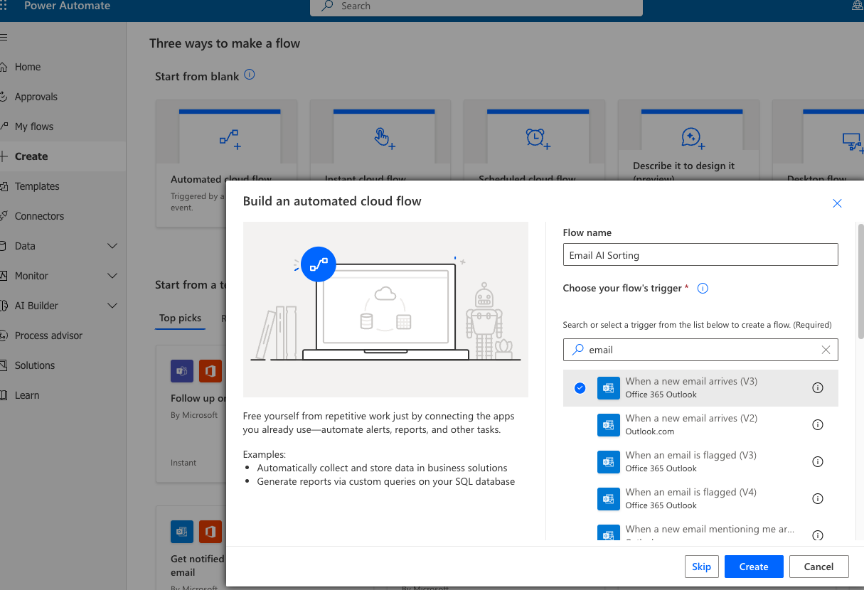 Now got to flow.microsoft.com and create a new Automated Cloud Flow that is triggered by “When a new email arrives”.