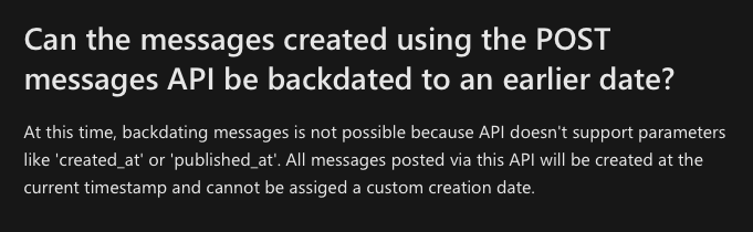 In regards of recreating things in Viva Engage there are some limitations. For example in Graph API (Microsoft) there currently is only endpoints for creating/updating a community, not the possibility for creating posts. To be able to create posts you need to use the old Yammer API, yes much of the backend of Viva Engage is still Yammer. Instead of complicating stuff, it’s then easier to use the Yammer API for creating the communities also. At the bottom of the API documentation for posting messages biggest drawback is mentioned, it’s not possible to backdate messages.