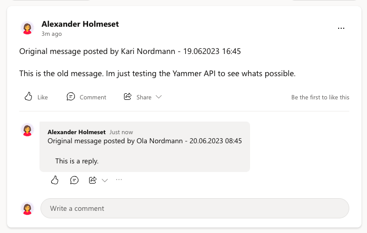What this means is that all recreated messages/comments will have the day of the migration as the timestamp. The next thing would be also to see if you do the hassle of impersonating users to post the message as the users that original posted it. My thought on this is that it’s the information that is most important here, and user/date is just details. It does not need to look perfect, as long as the text/files/photos is there. The way you can do it is by having a text at the top of the post/comments stating who posted the message and the original date. Here is an example of what it can look like with a recreation of a thread I did with the Yammer API and PowerShell.