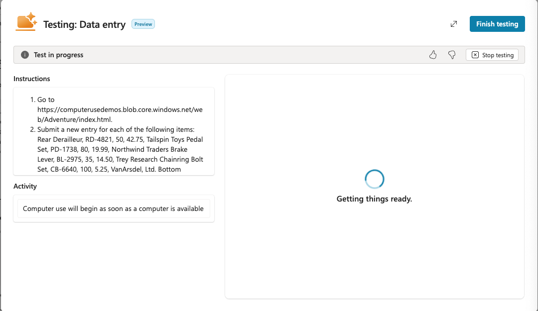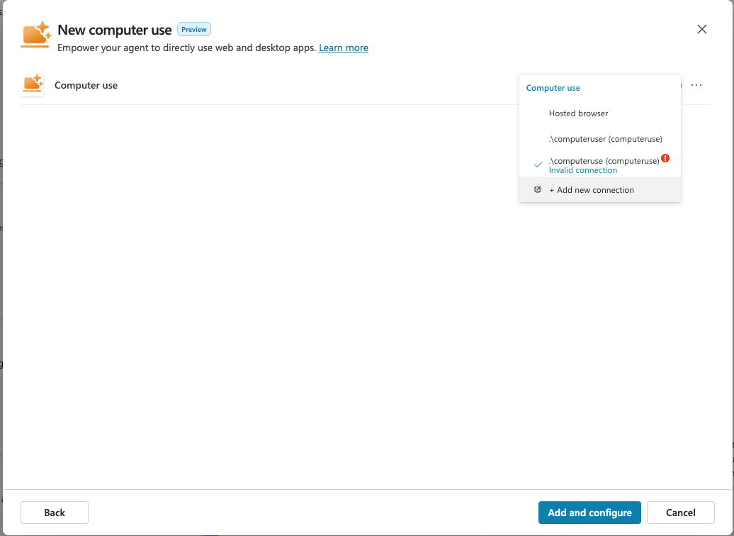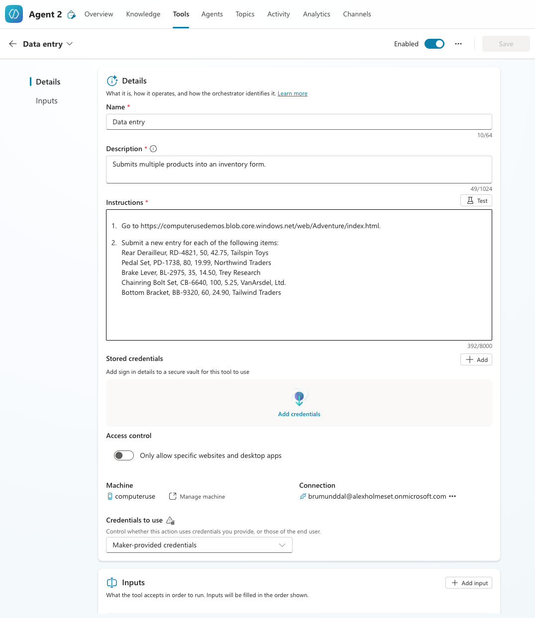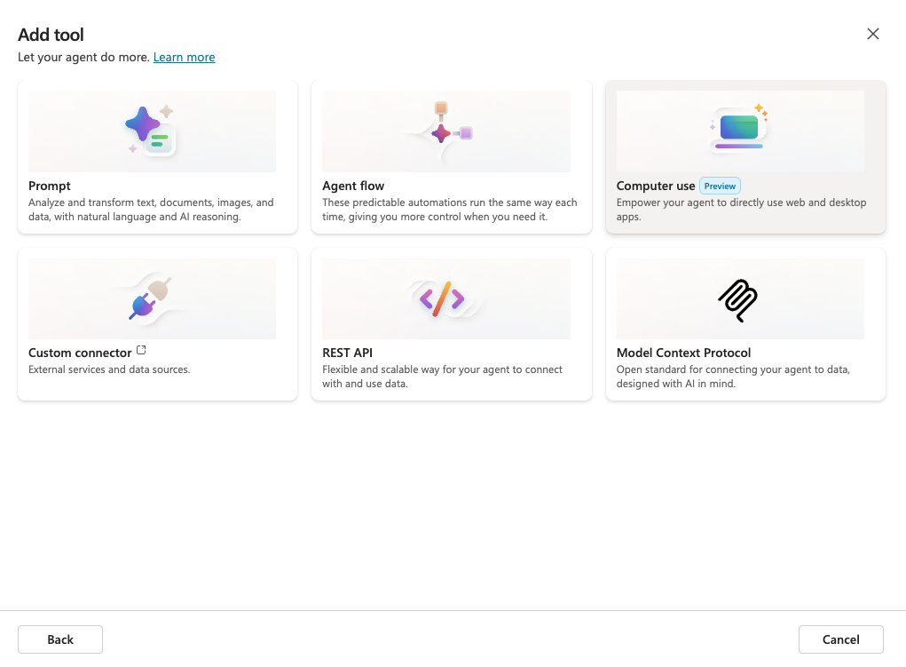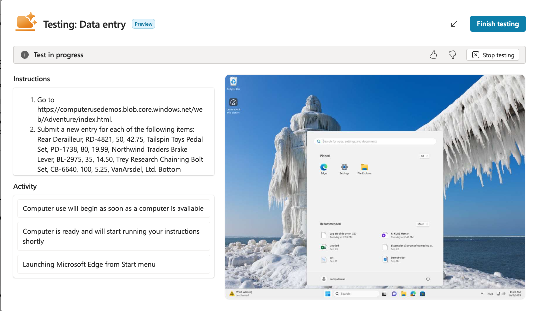 So what is Computer use? It’s a way for Copilot Studio to do actions on your computer or hosted browser (Windows 365). It’s powered by a AI model called Computer-Using Agnets, which has vision capabilities with advanced reasoning and the ability to interact with a GUI. Remember the times when you recorded macros to do some actions in a legacy software because there was no API to interact with it? Those days are over! Macros relied on button staying at the same place and that you used the same display resolution as when you did the recording. Now you can use natural language to tell the computer what to do, it takes a screenshot, analyze, clicks a button and so on, no matter the resolution and location of the buttons.