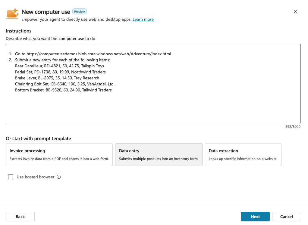 Im using a VM for this, so uncheck Use hosted browser. We will start of with one of the prompt templates, so click Data entry. Click Next.