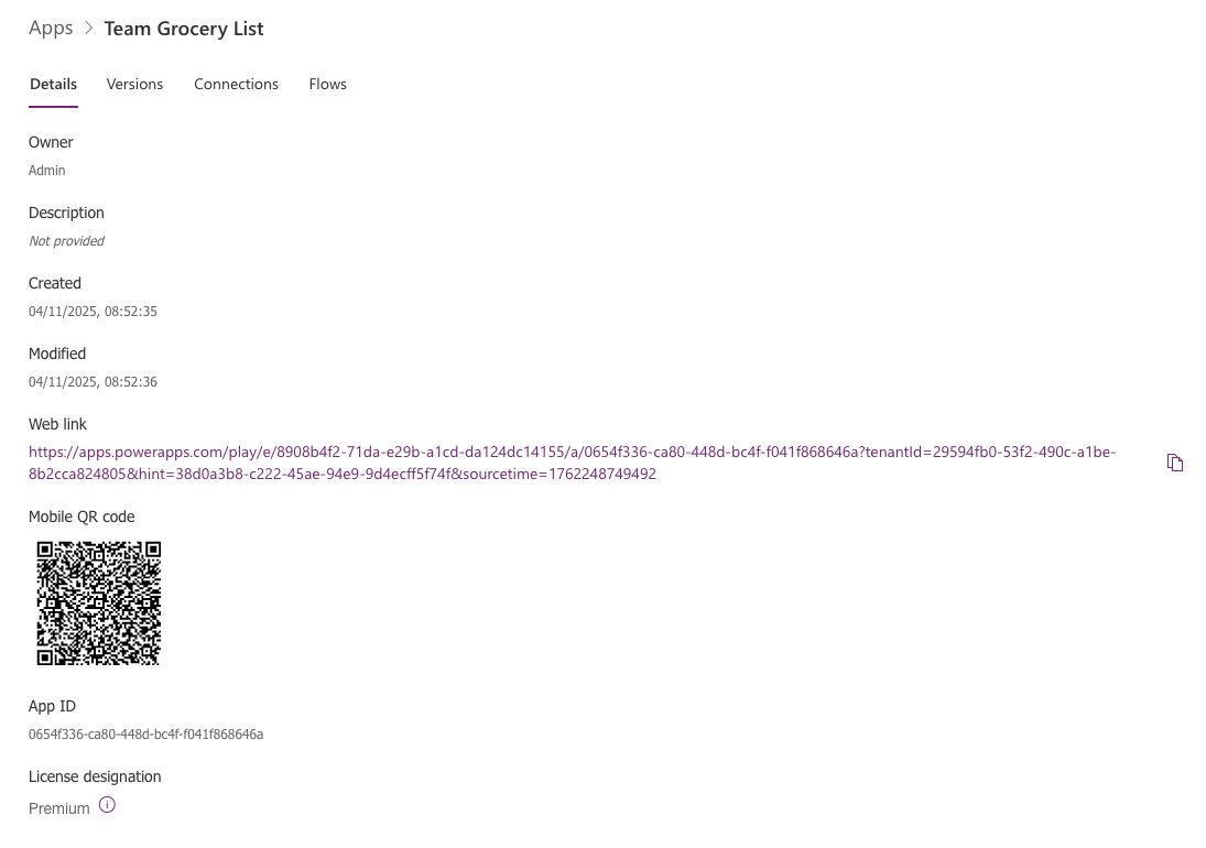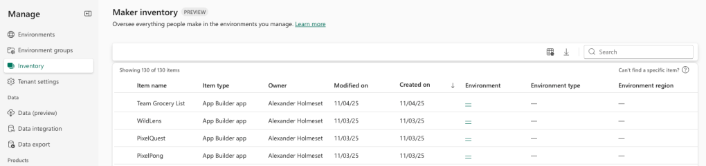 If you go to Inventory you find the apps you have created with App Builder, but environment is a “blank” clickable link.