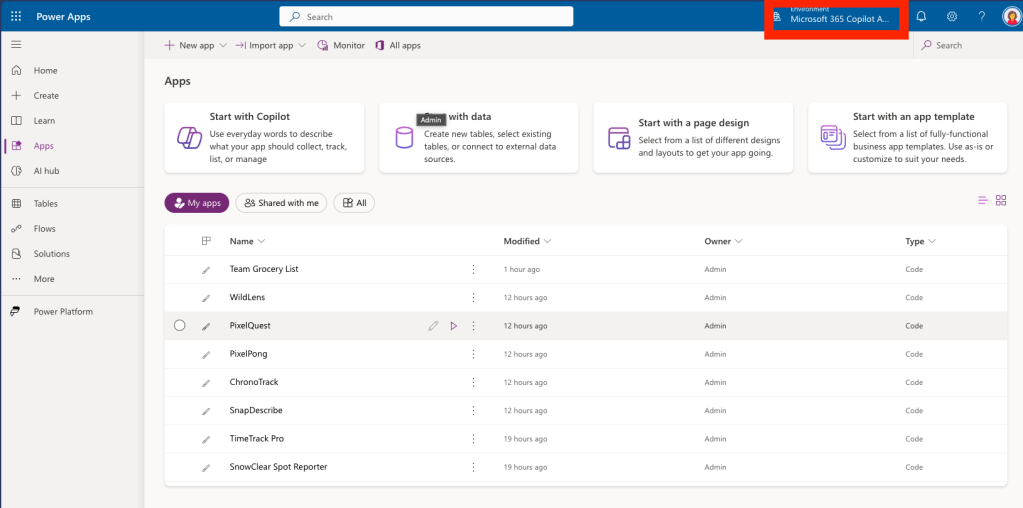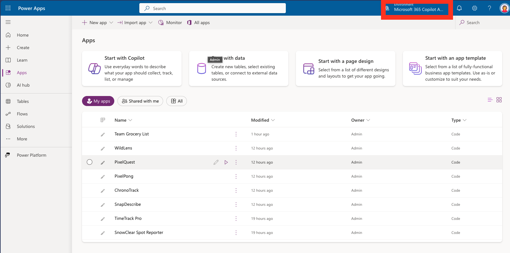 In the documentation it says that the M365 App Builder apps is stored in a hidden Power Platform environment available for admins and some data likes lists are store in a SharePoint site created for each app. Sow how do we find this Power Platform environment? If we take a look at the Environments menu in the Power Platform Admin Center you cant find any reference to it.