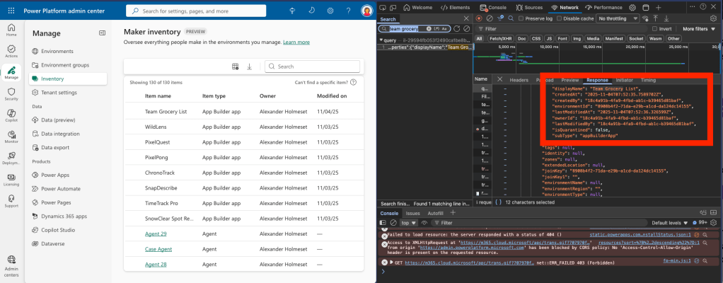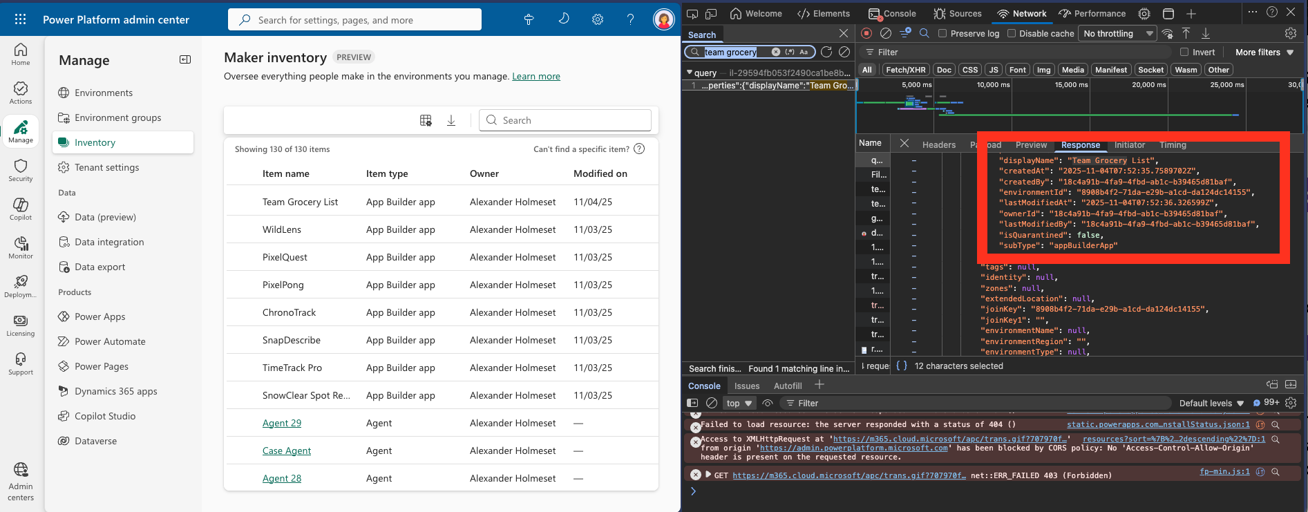 Let’s try something else, go back to the Inventory page with dev mode (f12) turned on in your browser. If you look at the object for one of the App Builder apps, you actually see an environment id.