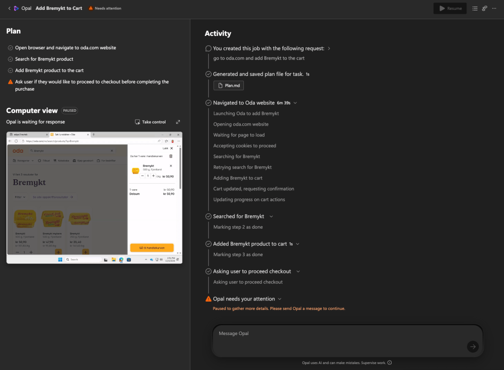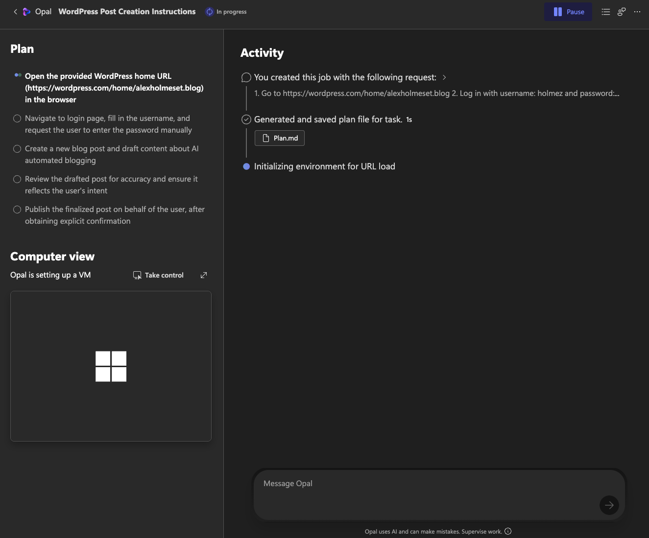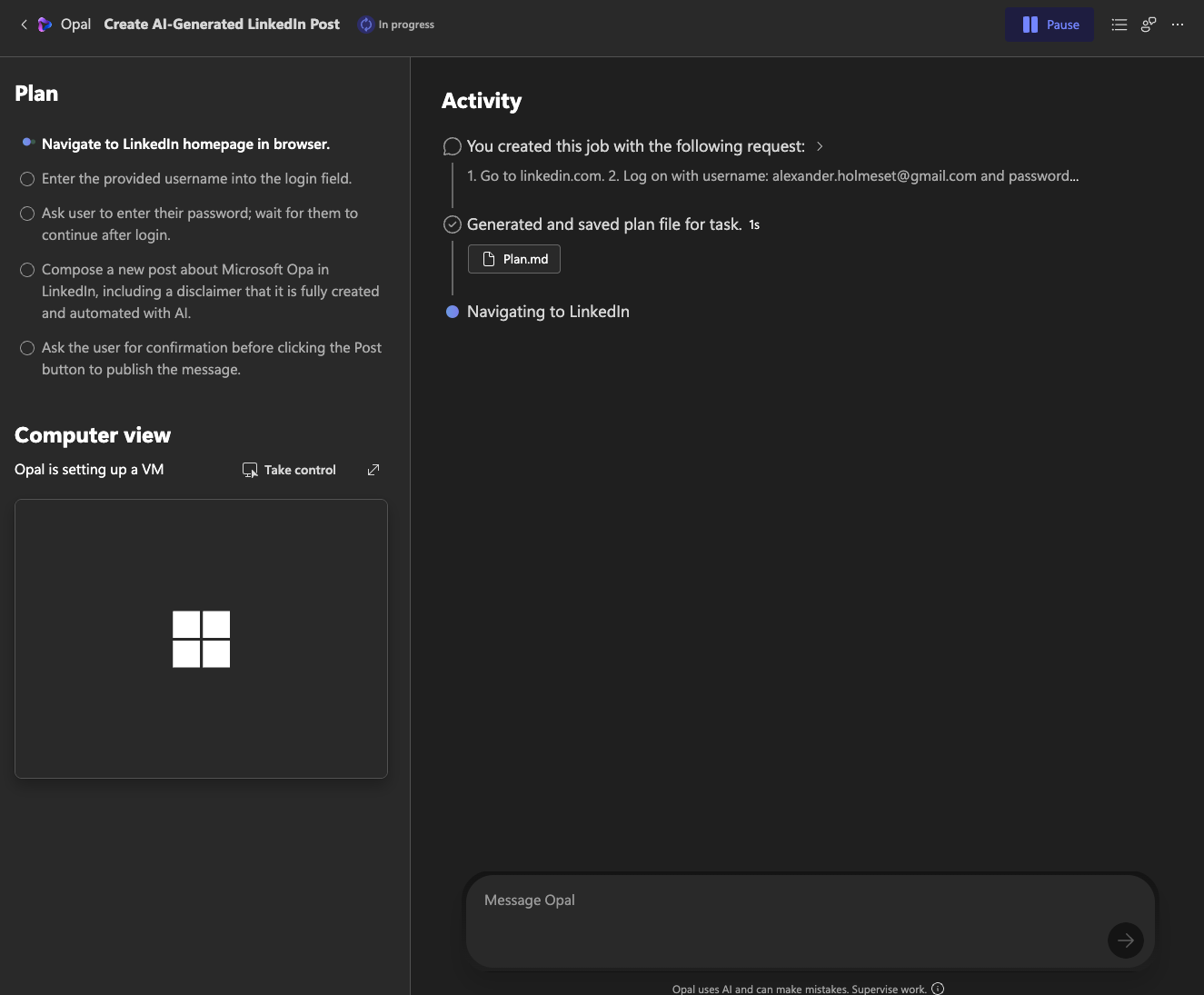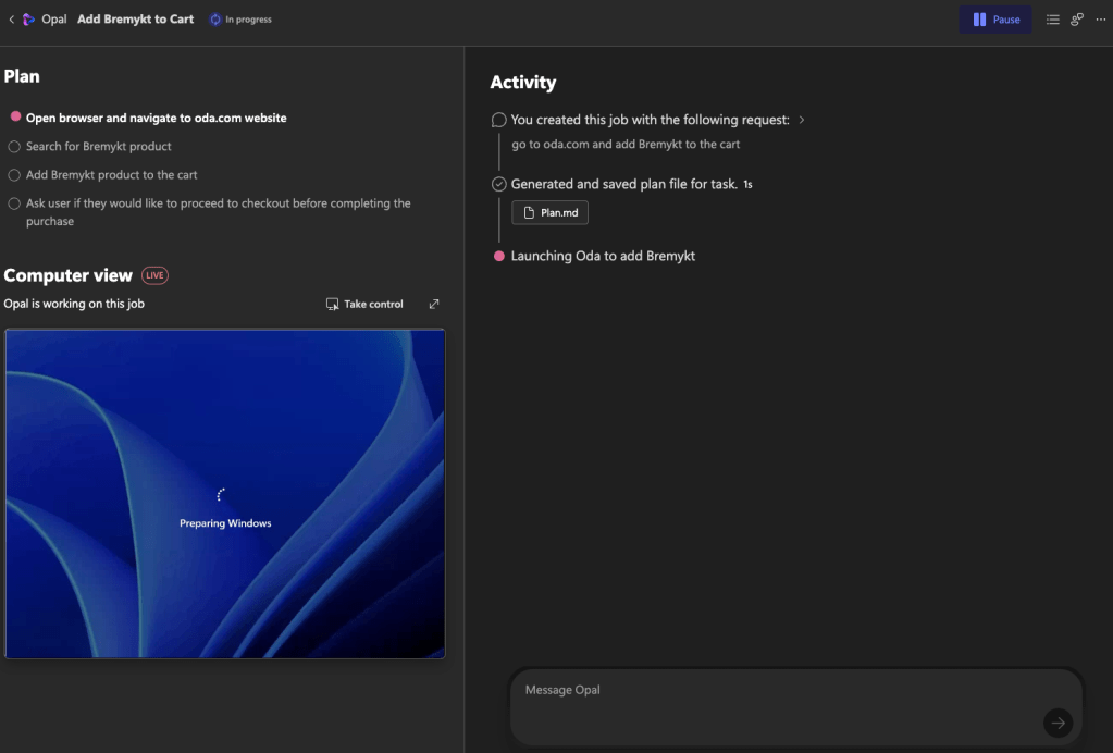 At Ignite in San Francisco, Microsoft launched Opal under the Frontier program. Opal is leveraging Computer-Using Agents that runs and does actions through Windows 365 Cloud PCs. It’s for personal use and meant to help endusers streamline their work process. This is the same model that you use for the Computer Use function in Copilot Studio, except by using Opal there is no need for the end user to setup a computer/vm, the Windows 365 Cloud PC boots and is ready for use as soon as the user sends the first prompt to Opal.