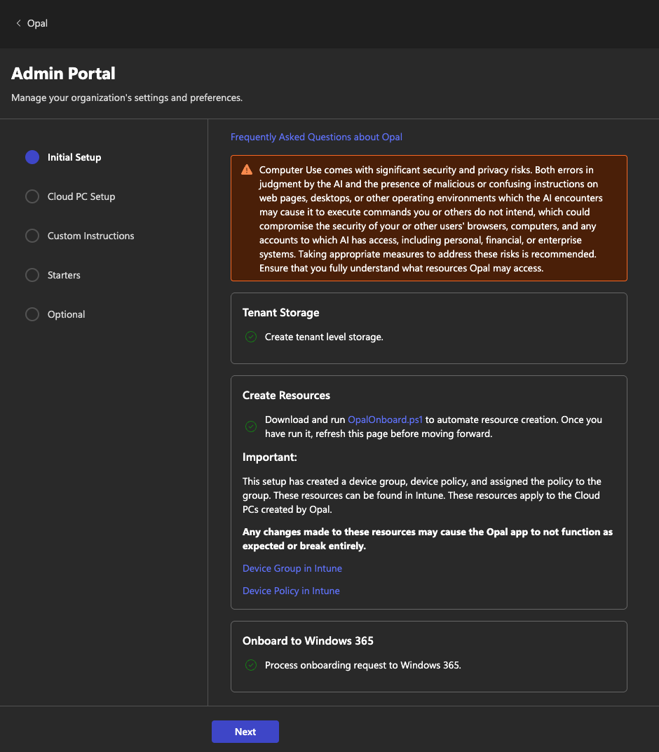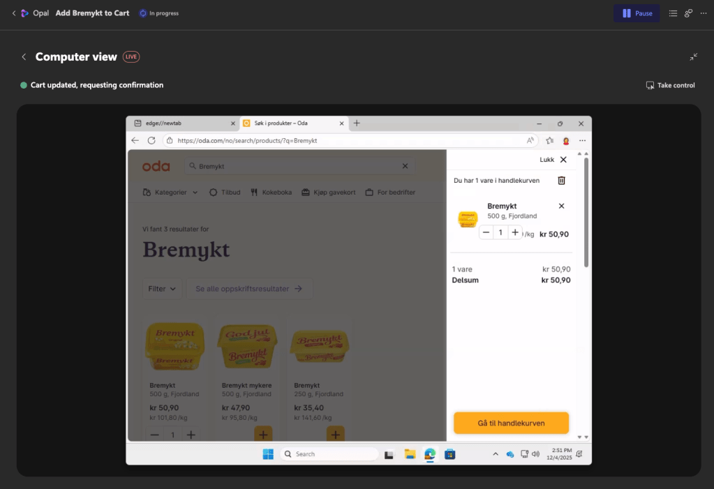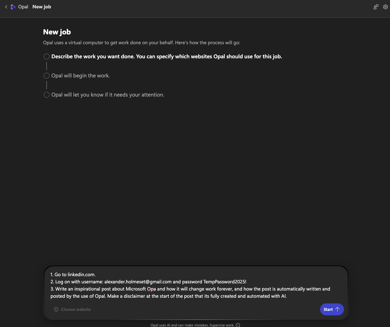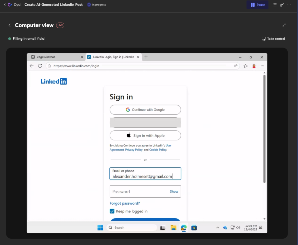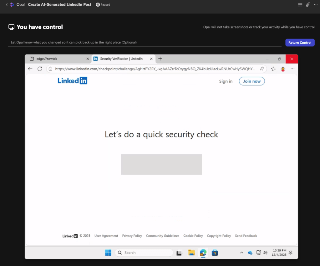 At Ignite in San Francisco, Microsoft launched Opal under the Frontier program. Opal is leveraging Computer-Using Agents that runs and does actions through Windows 365 Cloud PCs. It’s for personal use and meant to help endusers streamline their work process. This is the same model that you use for the Computer Use function in Copilot Studio, except by using Opal there is no need for the end user to setup a computer/vm, the Windows 365 Cloud PC boots and is ready for use as soon as the user sends the first prompt to Opal.