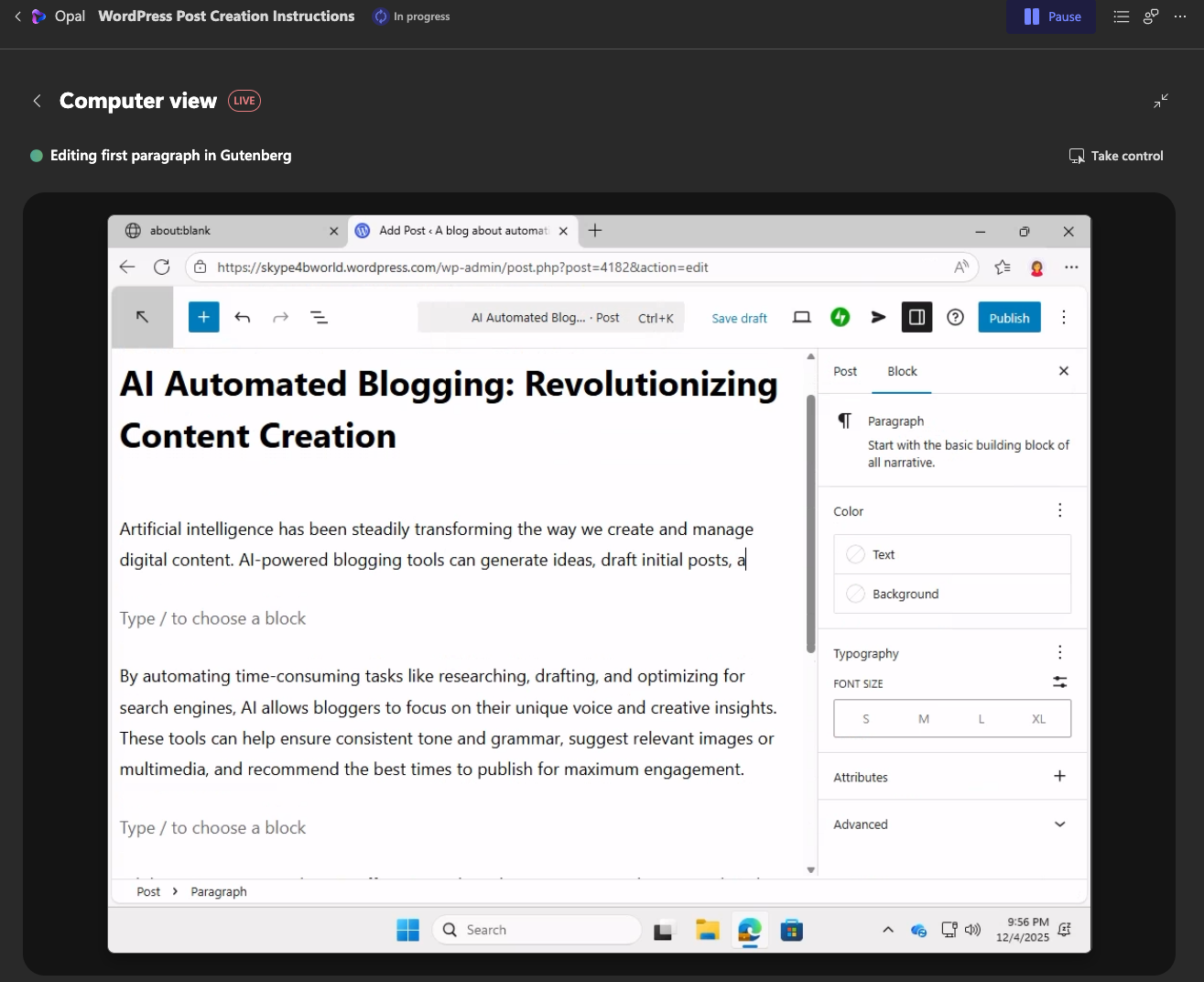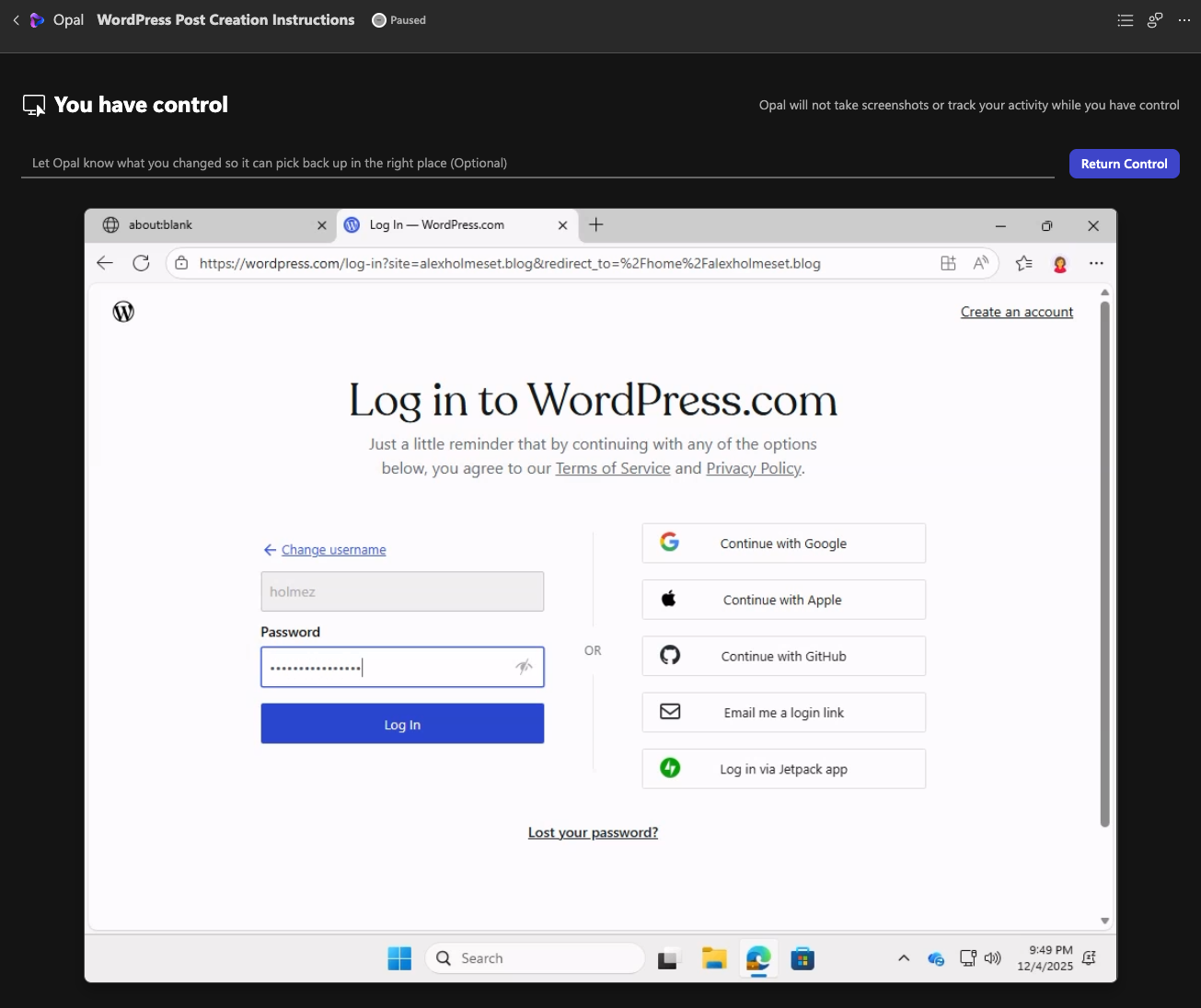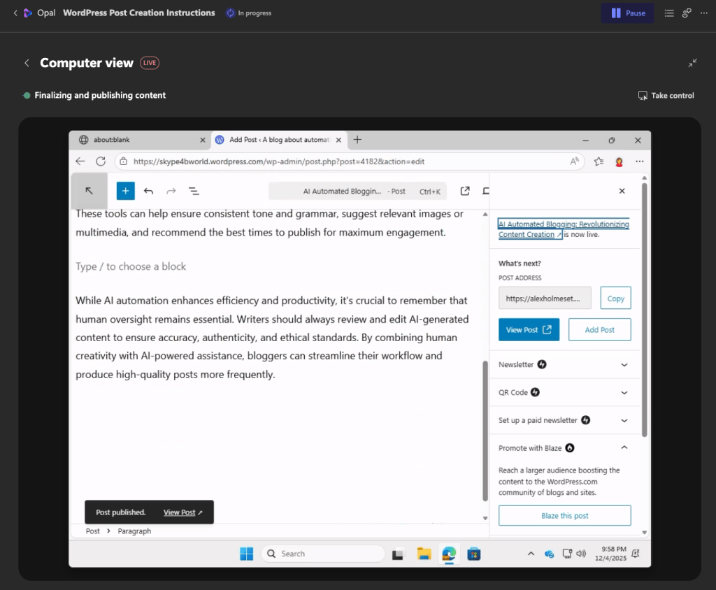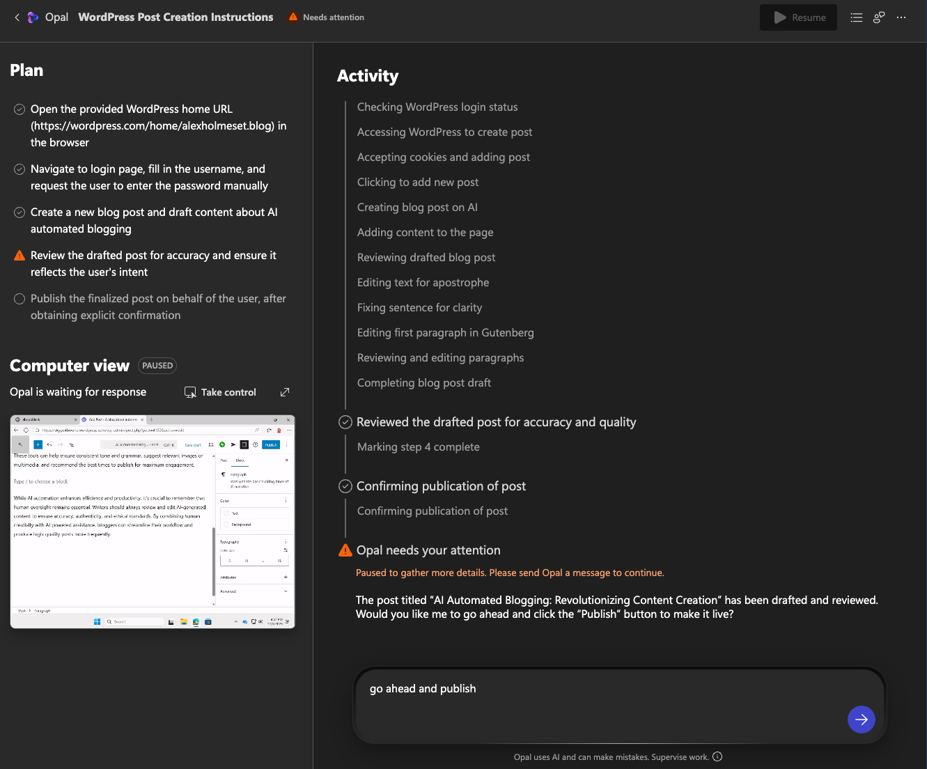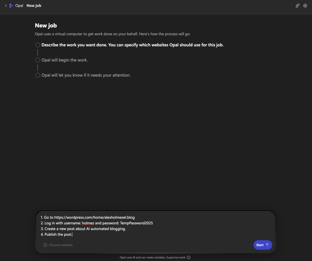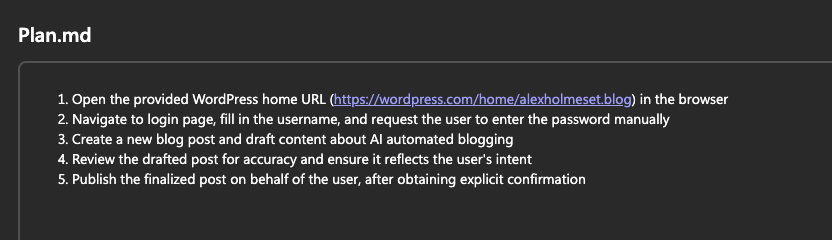 Next task was to ask it to log on to my WordPress account and create/publish a new blogpost.