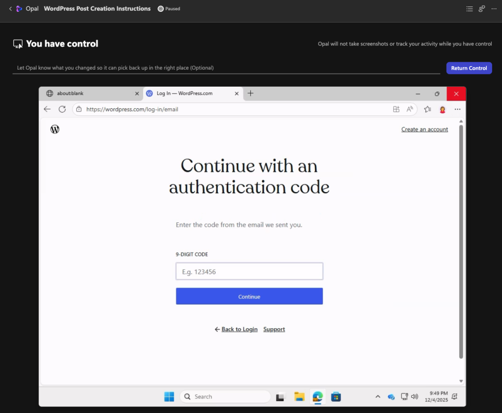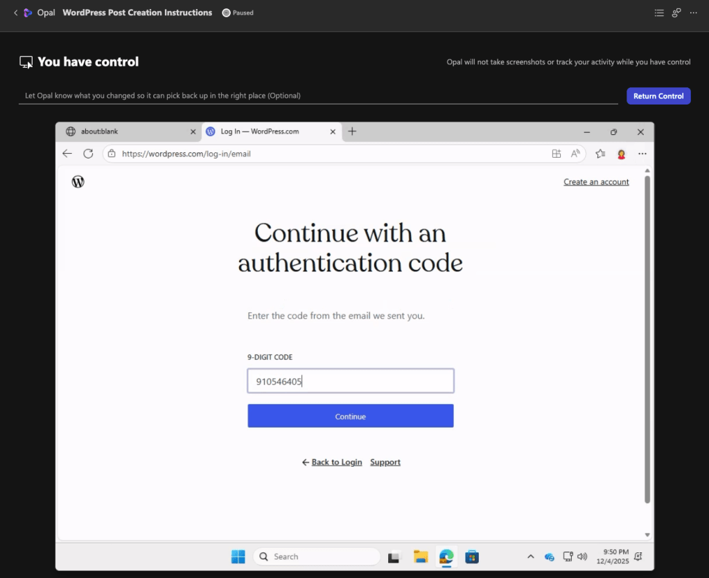 Something I have noticed is that Opal does not like to enter passwords for you. I needed to take control, login, and return the control.