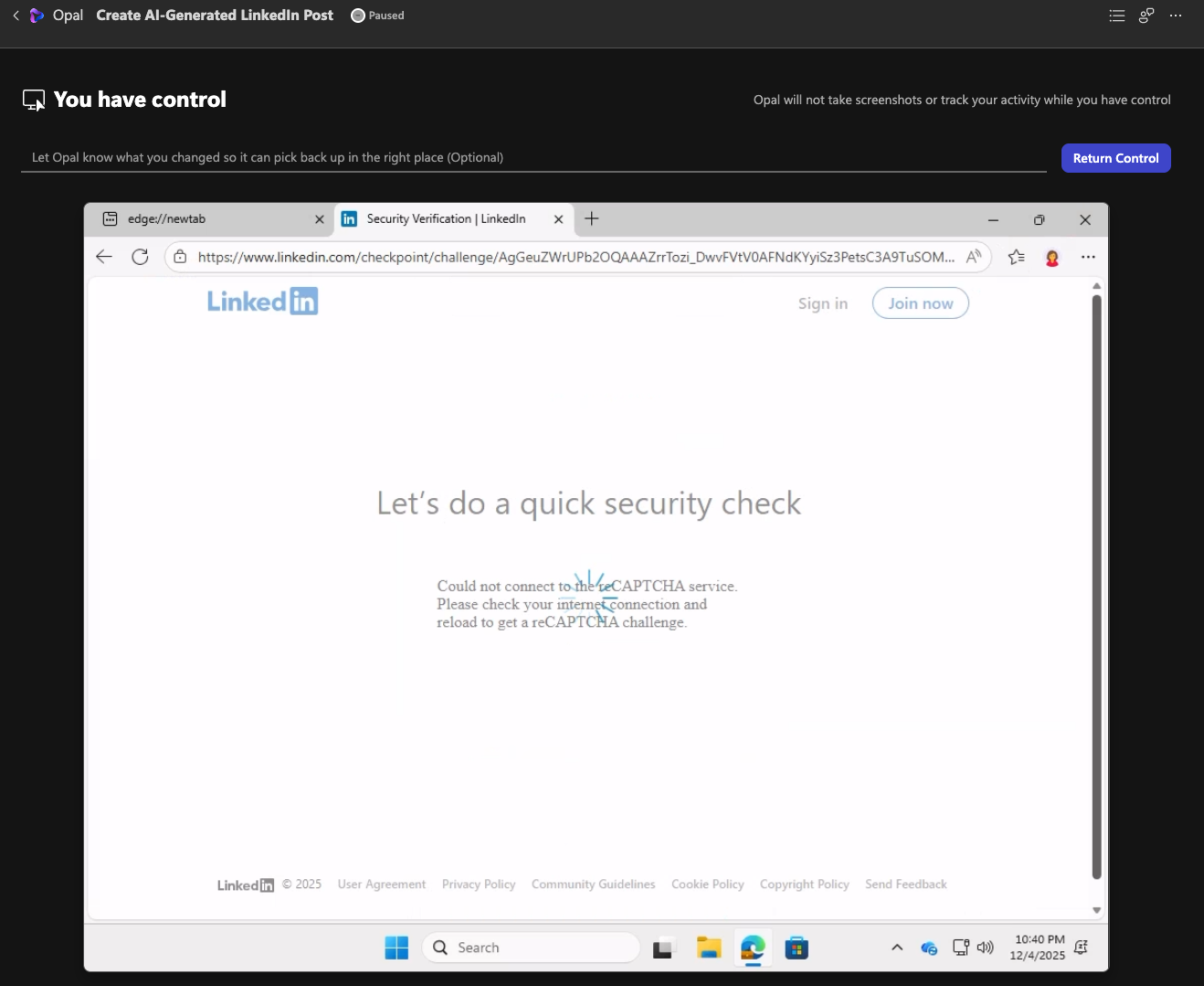 Next I wanted to see if I could automate posting on LinkedIn. As you can see on the screenshots I was stopped because the CAPTCHA test could not load.