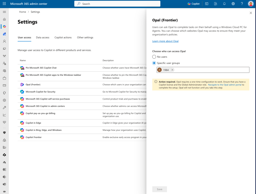 I started out by making sure I had a Copilot and Intone license in my tenant. Then I added a access group under Copilot Admin -> Settings -> User access -> Opal.