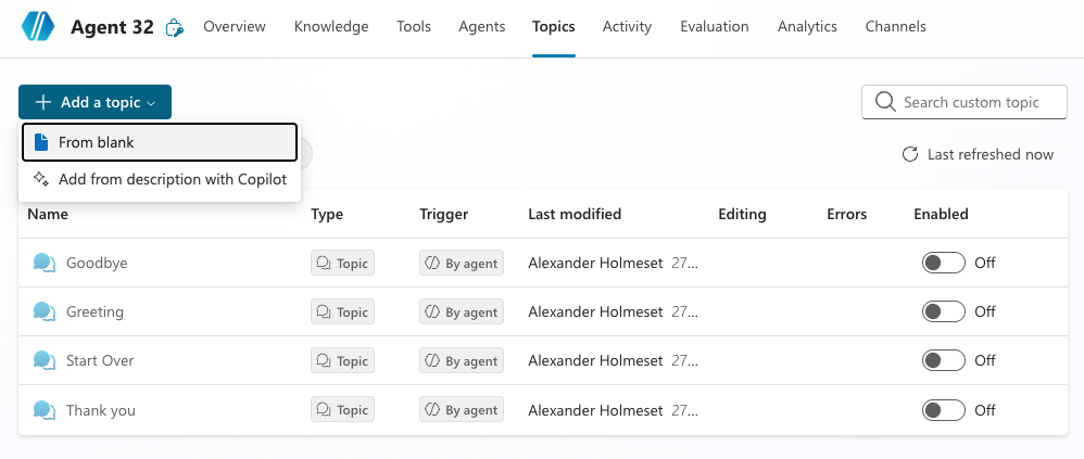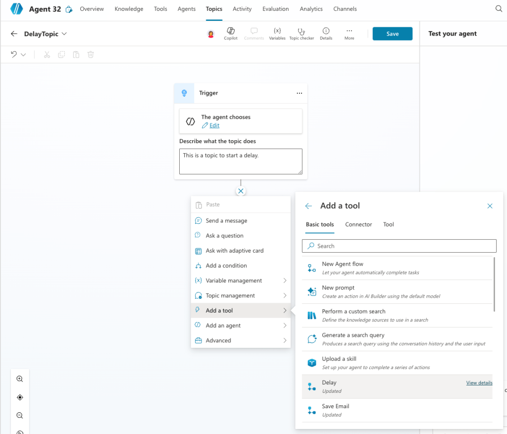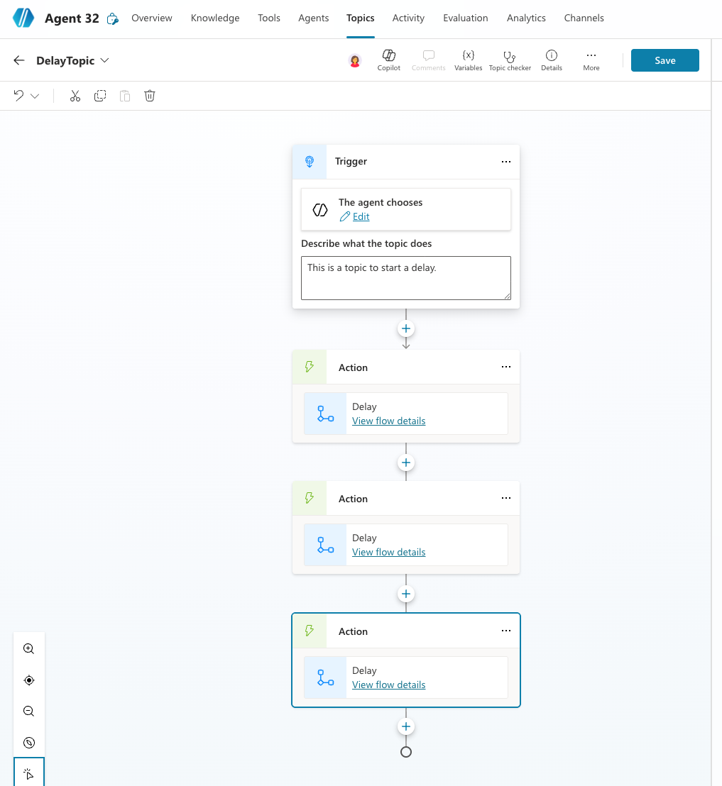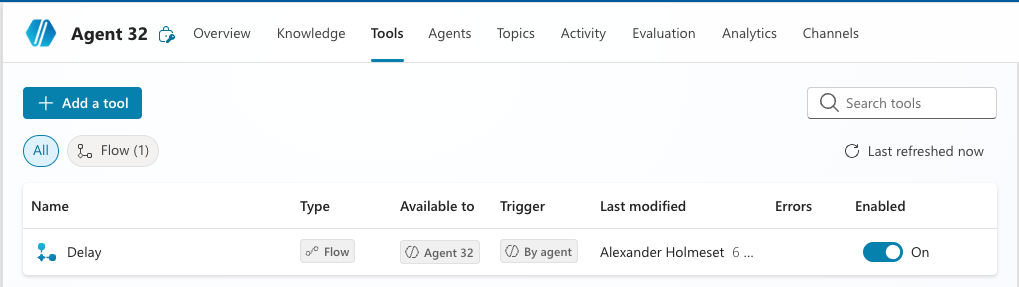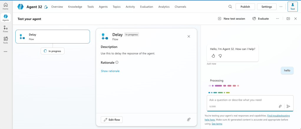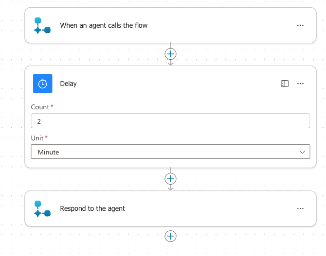 This is a bit of a setback, but not impossible to solve. In an agent I was developing I needed it to wait 15 minutes before continuing with the next step in its instructions. 15 minutes is about the time it takes from a new document added to a Share Point knowledge source and it have been indexed. So how do I solve this? First I tried creating a agent flow that had a delay of 90 seconds and create an instruction like this: