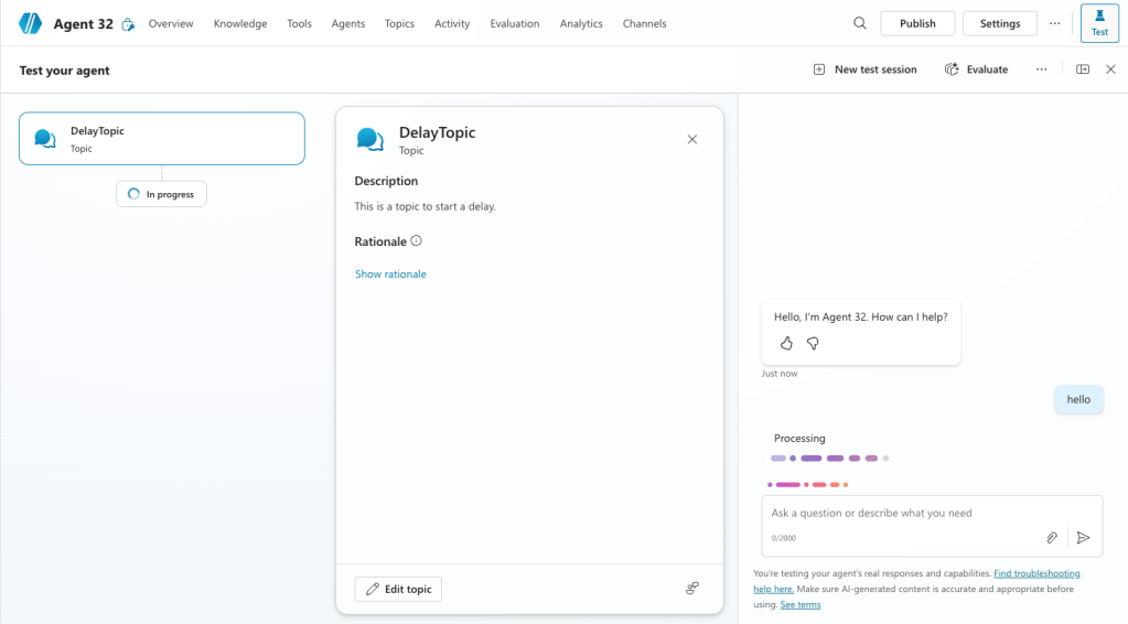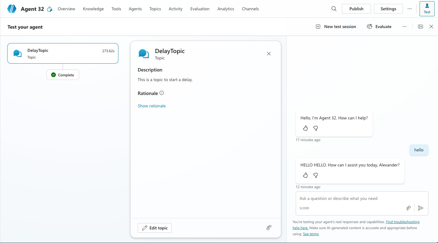 Now when I say hello to the agent, it triggers the DelayTopic:
