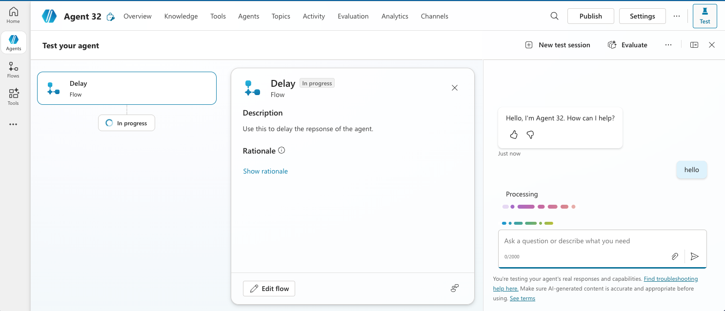As you see, the agent just ignores your instruction and replies right away. So what about using an Agent flow (You find it under Tools) and add a delay action? I also want the delay to be 2 minutes.