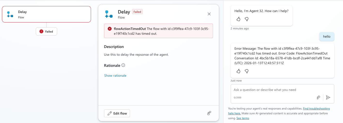 If you take a look here, you see that there is a 2 minute limit for an agent flow to respond back to the agent.